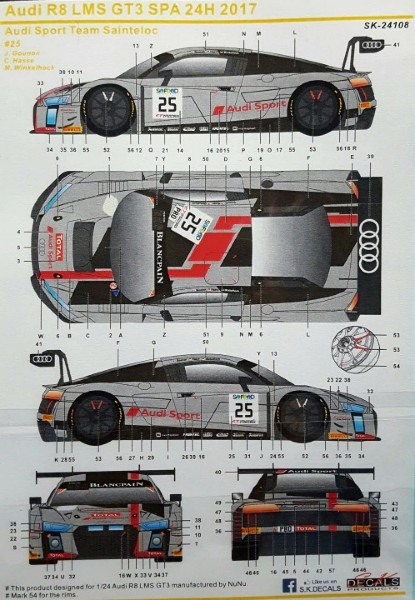 Sleva 100,-Kč (Discount 4,-Euro) Audi R8 LMS GT3 2017 24H of Spa Winner Audi Sport Team Sainteloc 1/24 - SKDecals