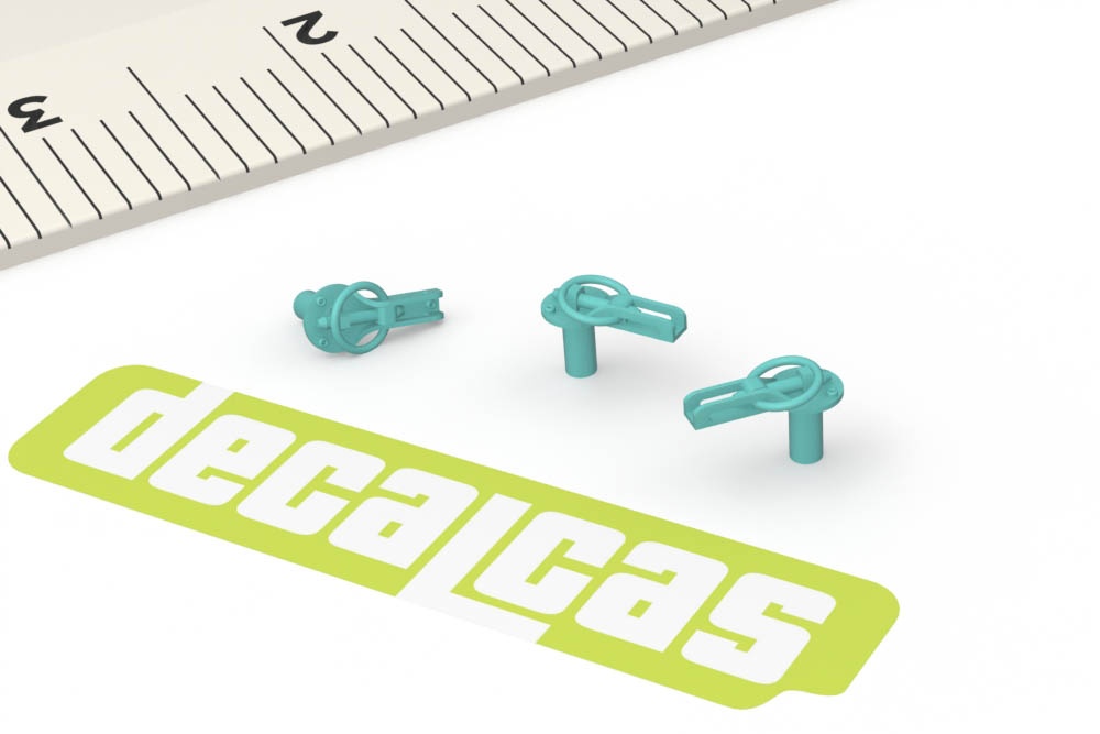 Set of hood latches with pin, designed for use on 1/24 and 1/20 scale models. Includes a total of 12 closures made of resin by 3D printing. The extreme detail with which these closures are designed and manufactured provide greater realism to your models.