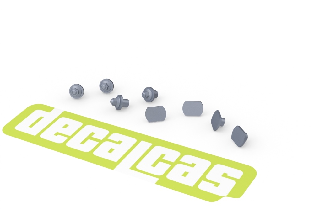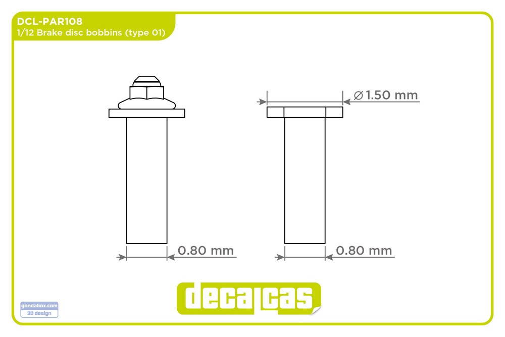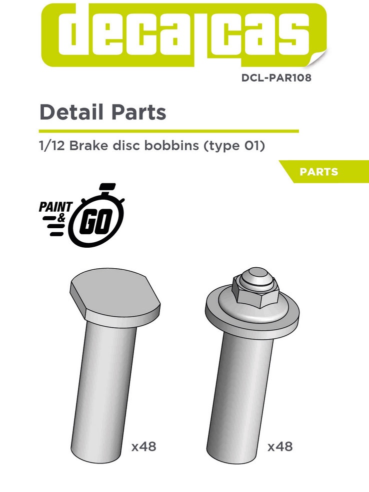 Guide bushings for use on 1/12 scale brake discs. Enhance the realism of your brake discs with these bushings, which come separated into two parts, one of the pieces being the flat T-shaped outer bushing and the other being the inner nut. Made of resin using 3D printing, they reproduce all the details, such as the chamfered part of the screw nut. Made with the usual quality of DECALCAS products, with these pieces the use of primer is optional, so you will only have to worry about painting and gluing on your scale model.