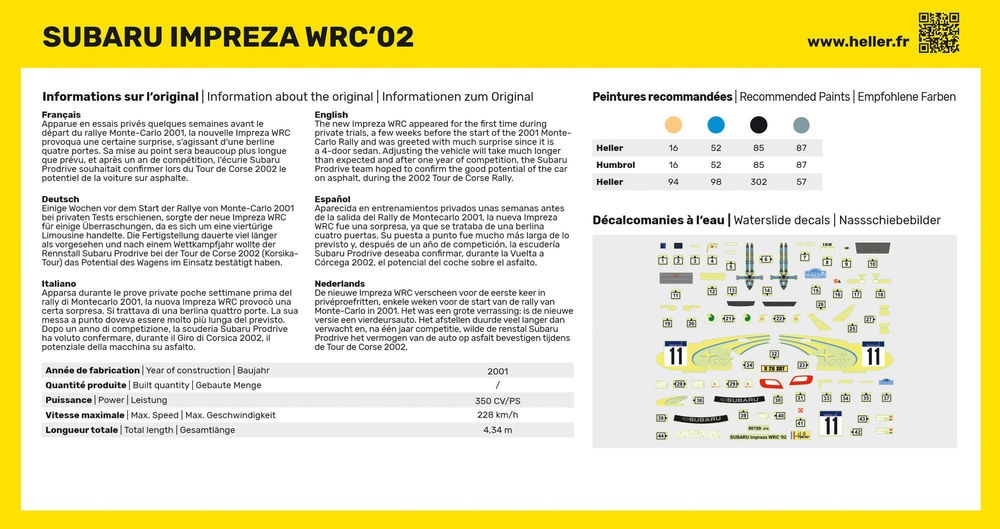 The new Impreza WRC appeared for the first time during private trials, a few weeks before the start of the 2001 Monte-Carlo Rally and was greeted with much surprise since it is a 4-door sedan. Adjusting the vehicle will take much longer than expected and after one year of competition, the Subaru Prodrive team hoped to confirm the good potential of the car on asphalt, during the 2002 Tour de Corse Rally.