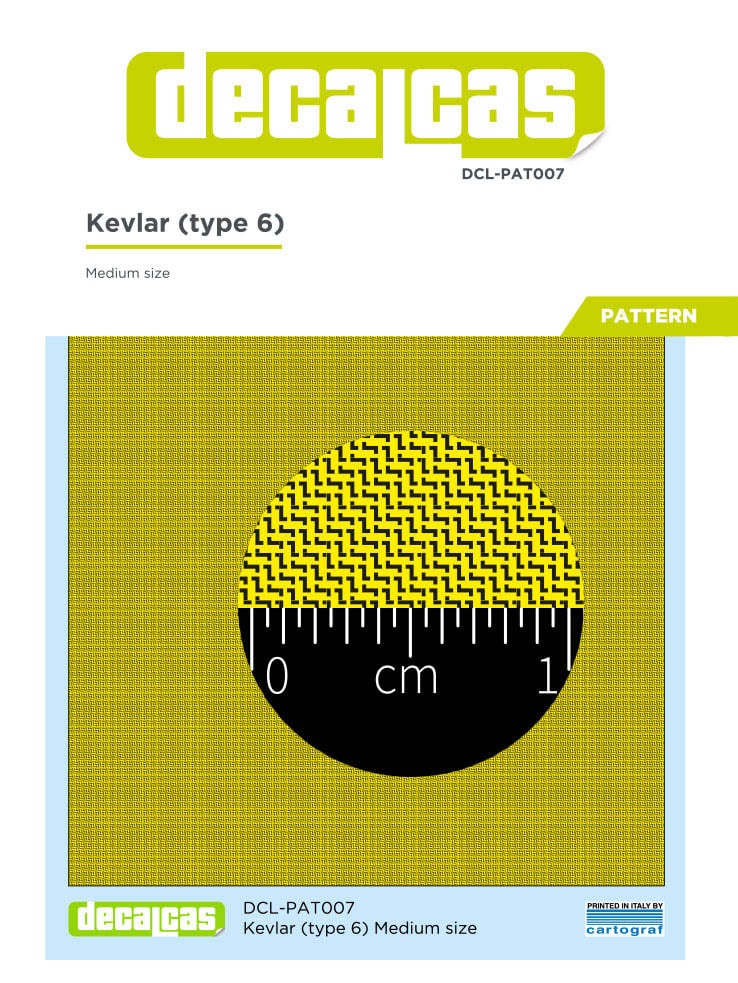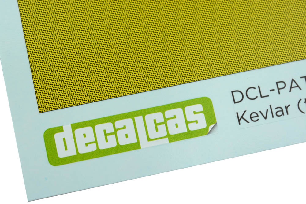 Type 6 kevlar texture decal in medium size. This type of kevlar, with yellow and black appearance, imitates the real-world „Hybrid Twill Weave Carbon Kevlar“ fabric used in the light parts of competition vehicles. It is perfectly valid for use in scale models 1/12, 1/20 and 1/24. The decal has been printed by Cartograf with the latest and most modern decal manufacturing technology to achieve a definition and detail in the pattern never seen before.