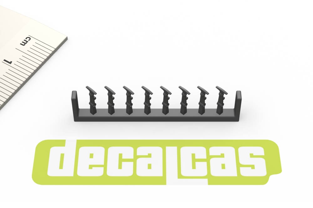 Set of bonnet latches in 1/24 scale. Includes a total of 8 closures made of resin and elastic rubber by 3D printing. The extreme detail with which these closures are designed and manufactured provide greater realism to the models, since the pieces can be attached allowing the mobility of the rubber closure on its anchors.