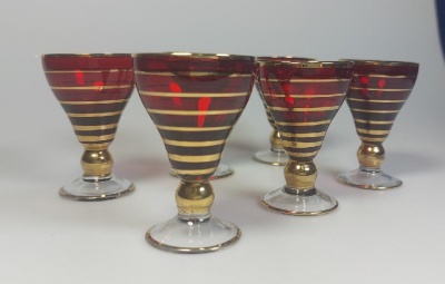 Likérovky - Bohemia Glass - rubínové sklo zlatě zdobené - 6ks - Retro