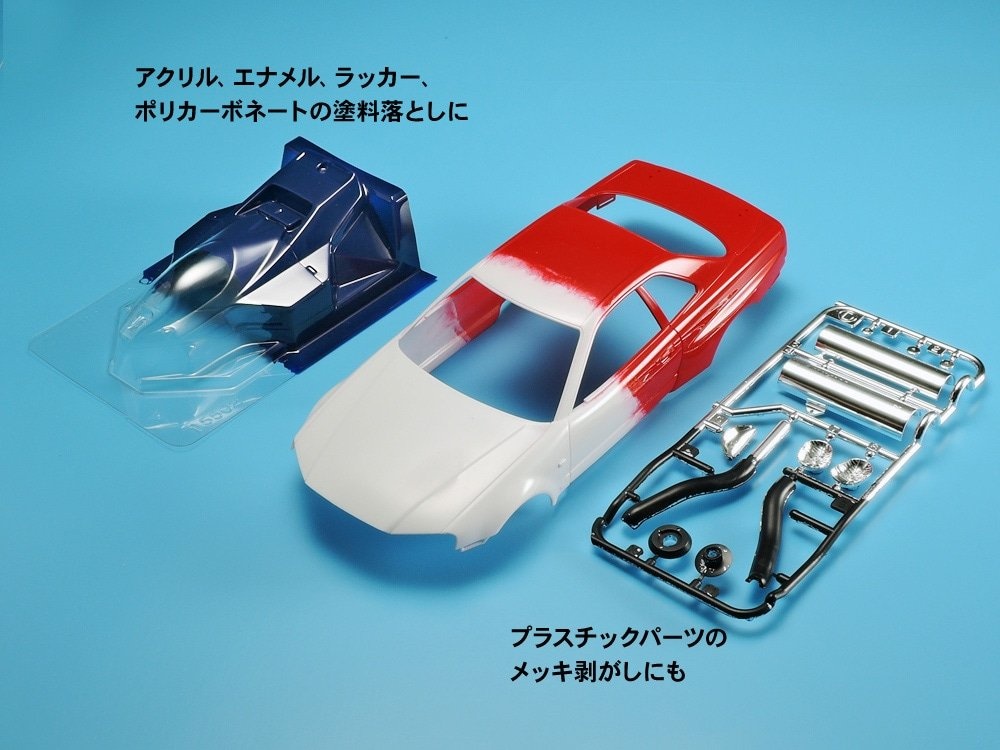 Tento víceúčelový kapalný přípravek je schopen odstranit akrylové, smaltové a lakové barvy, včetně barev určených pro použití na polykarbonátu. Je šetrný k povrchům modelových dílů, nezpůsobuje zakalení při použití na polykarbonátu a lze jej použít také k odstranění kovového pokovení. ★Vodou rozpustný materiál má nízkou úroveň zápachu. ★Lze použít jednou nebo dvakrát. ★Není určen k použití na ABS pryskyřici.