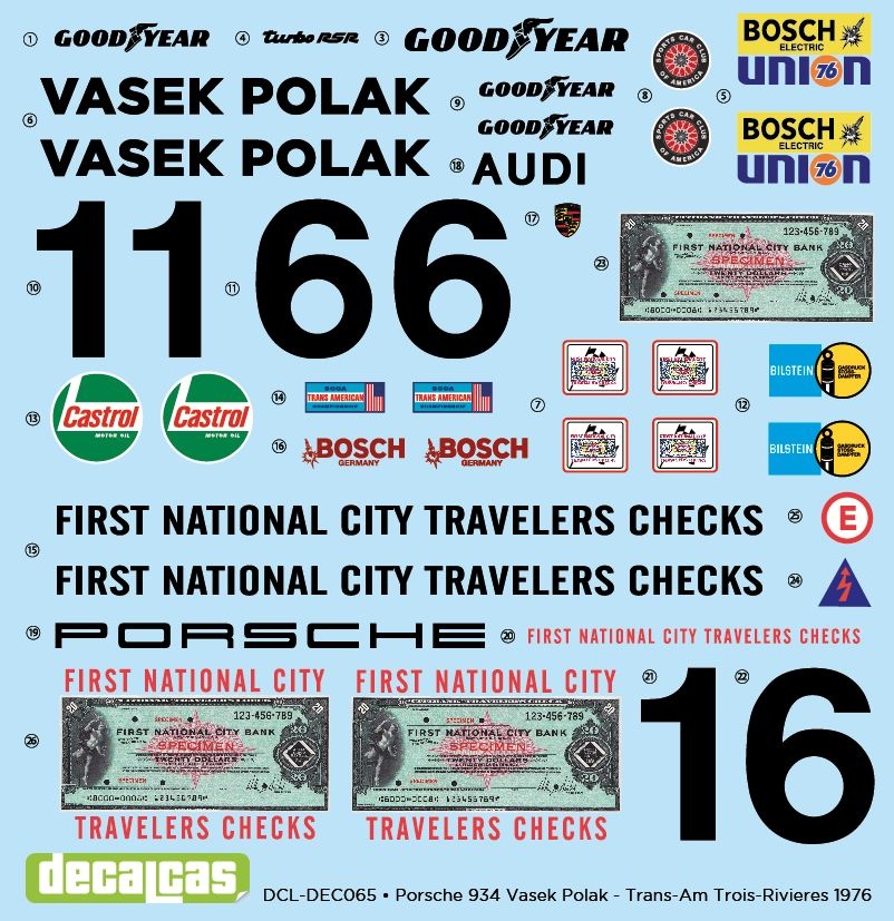 Porsche 934 RSR Team Vasek Polak sponsored by First National City Travellers Checks - 1976 1/24 - Decalcas