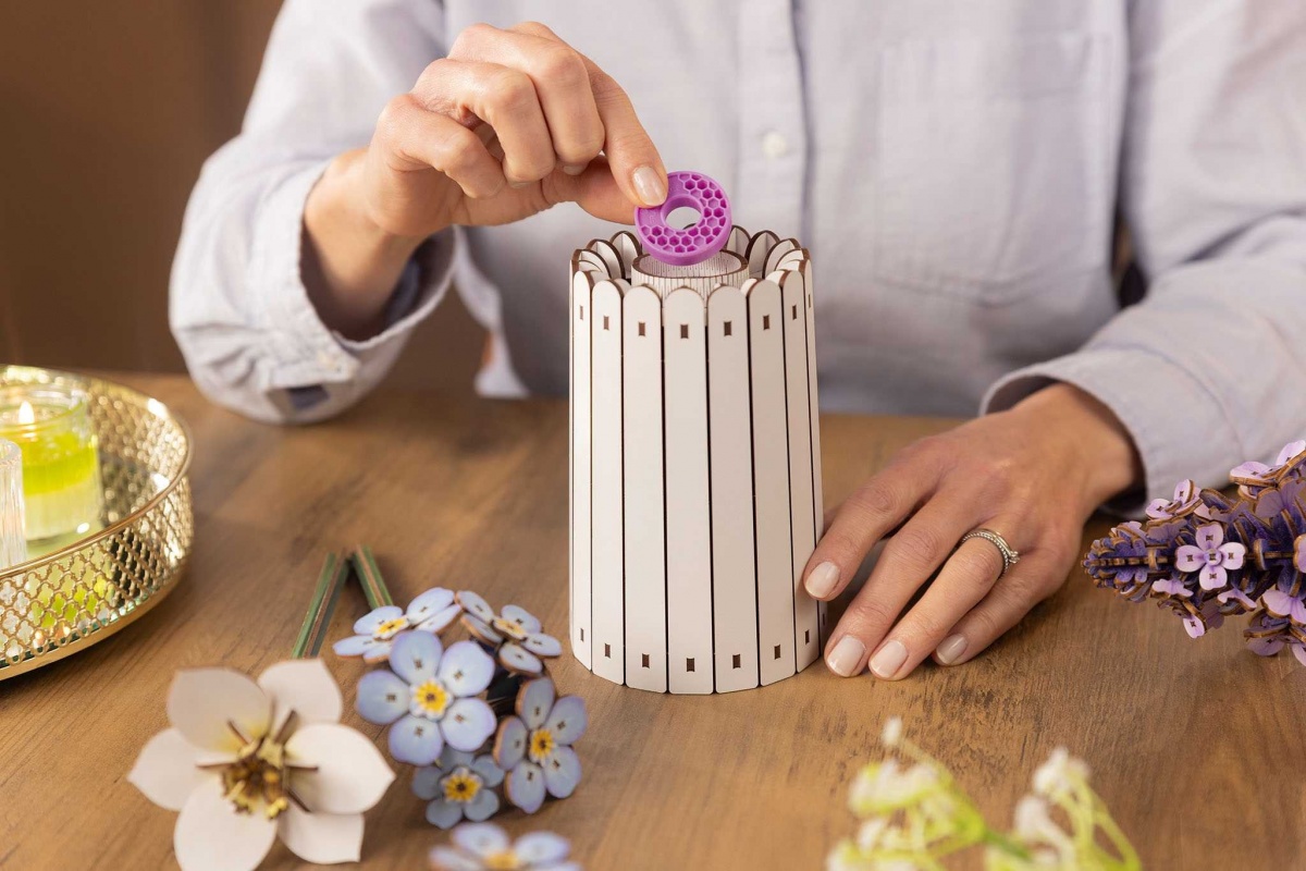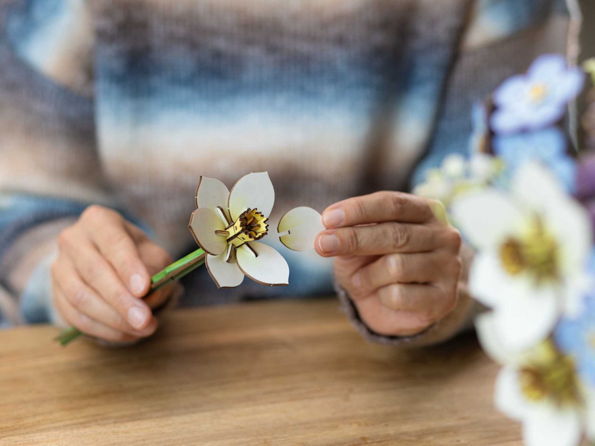 Dřevěná květina ke složení. Velikost: 32 cm. Balení obsahuje 360 dílků.