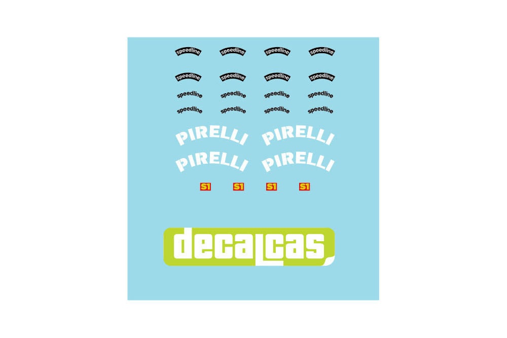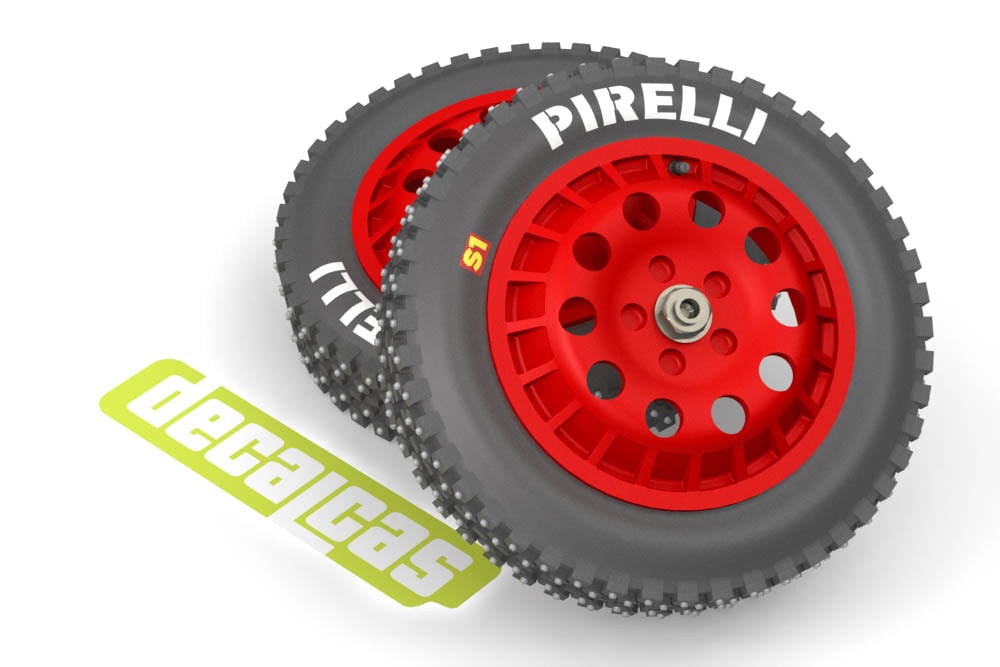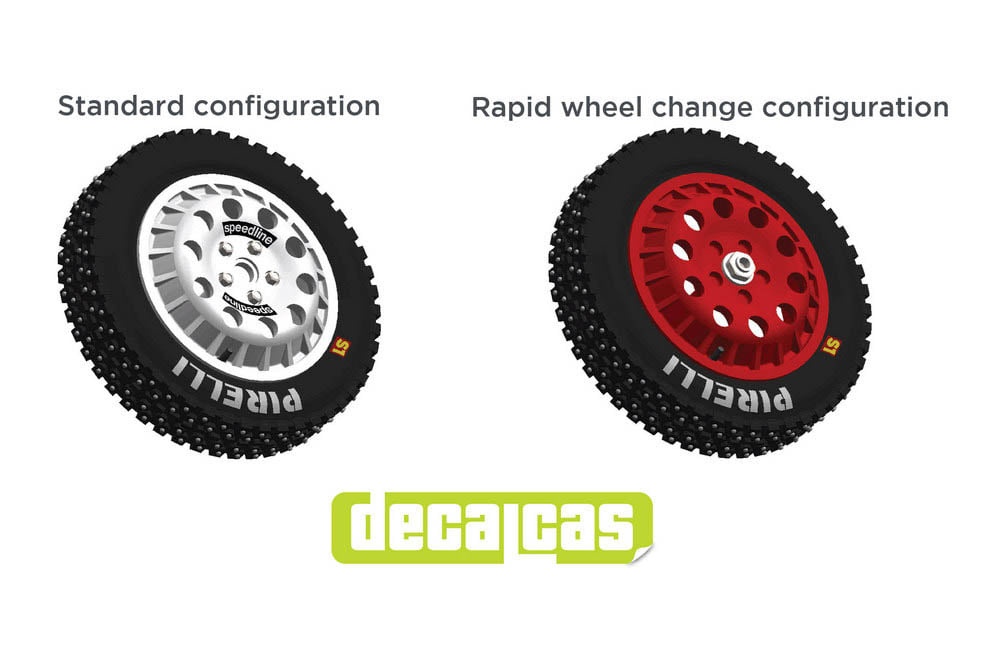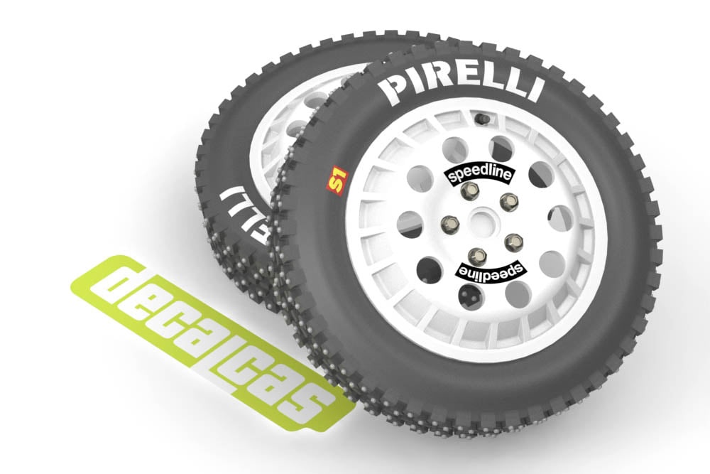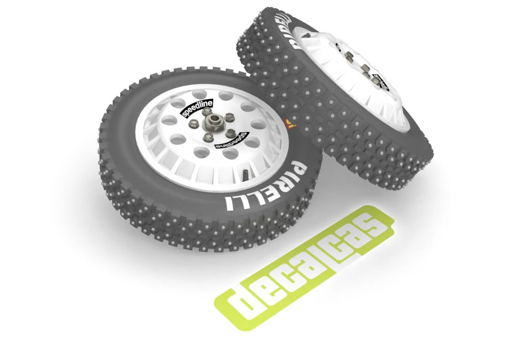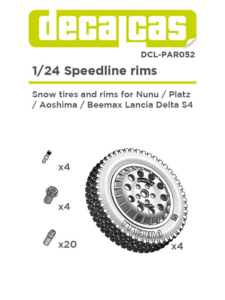 Set of 4 wheels in 1/24 scale with nuts, air valves, and a decal sheet including Speedline logos and tire marks, designed for the Nunu / Platz / Aoshima / Beemax models of the Lancia Delta S4. These rims have been designed to fit perfectly in the model replacing the original ones, to recreate the configuration of tires with ice studs. They are supplied with the nuts initially used to secure the rims (configuration of 5 nuts per rim), as well as with the central nut used in some tests where it was necessary to make quick wheel changes. In addition, a complete set of decals printed with digital technology is provided with the different Speedline logos used and the tire's own markings. In order to honor even the tiniest detail, the amount of white on these decals has been carefully tuned so that its transparency simulates the tone of the actual tire markings, as these were sprayed onto the tire with a stencil.