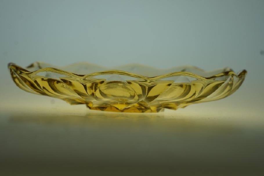 Desertní talířek z lisovaného rosalinovéhoskla. Originální stará ruční práce. První polovina 20.století.