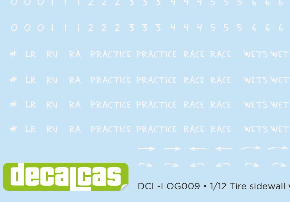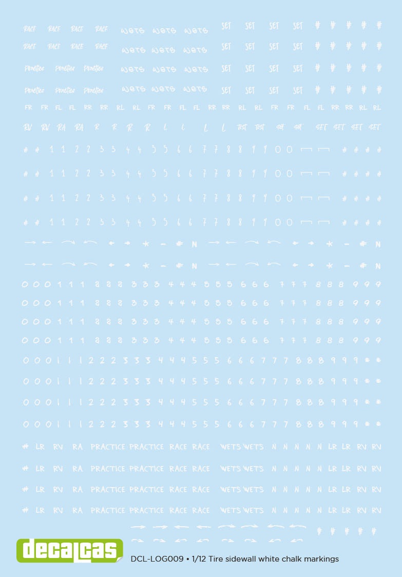 Tire sidewall white chalk marking decals in 1/12 scale: An extensive decal sheet with a variety of white numbers and markings such as those commonly found on Formula 1 and GTs car tires. Includes inscriptions such as „practice“, „set“, „test“, …